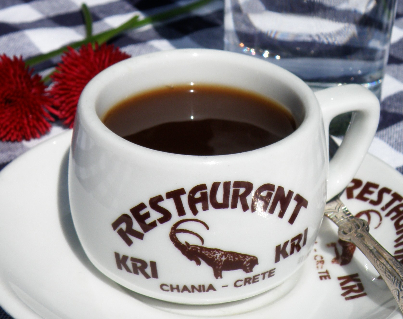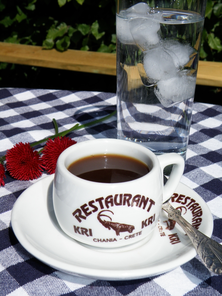 Koppen på bildene har jeg fått av en kelner på restaurant Kri-Kri i utkanten av Aghia Marina på Kreta. Min sønn samler på små kopper, så jeg fikk tusket til meg en kopp her siden kelneren husket guttungen fra tidligere opphold.