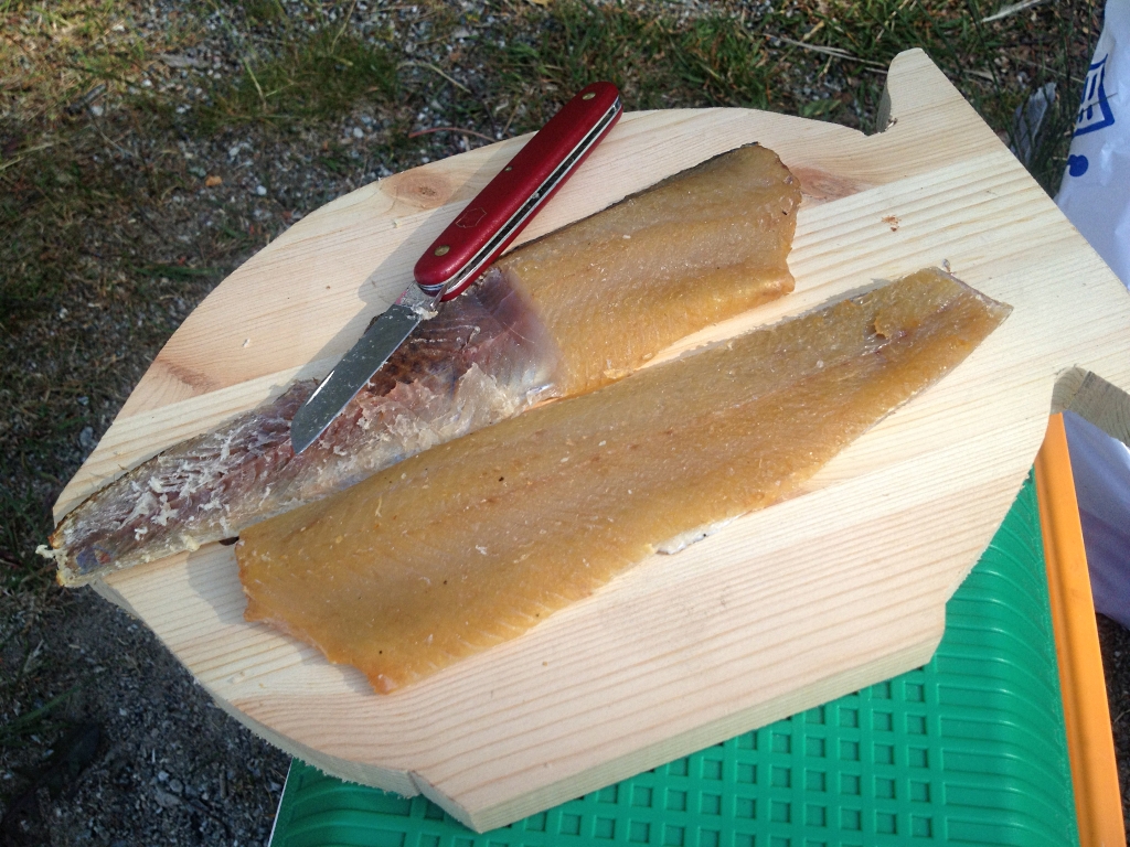 Men vi hadde med en liten smaksprøve til. Min mann hadde røkt et par ørreter natten over. Da hadde de først ligget i salt i ca 3 timer. Akkurat passe salt, og akkurat passe røkt. Dette avhenger selvsagt også av størrelse og hvor fet fisken er.