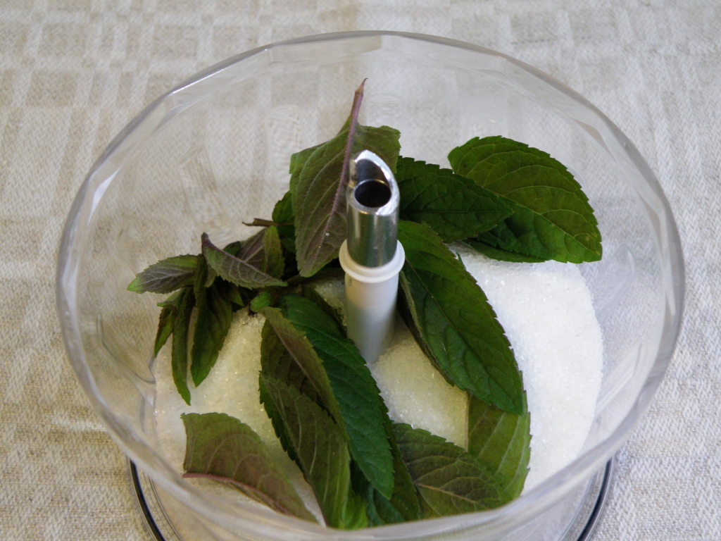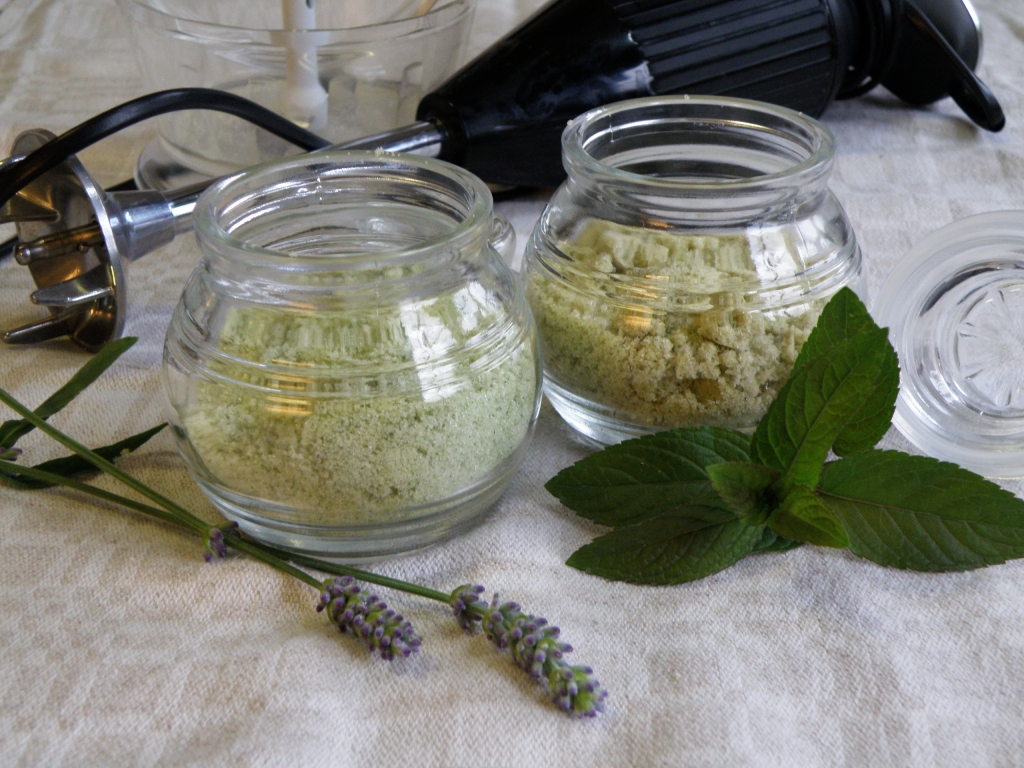 Jeg gjorde det så enkelt at jeg hadde 1 dl sukker i Bamix’ hakkeren, tilsatte frisk peppermynte som den ene varianten og frisk lavendel i den andre. Ca 20 store peppermynteblader og 6 lavendelaks. Lavendelen var litt lite utsprunget, men det var ingenting å si på lukt og smak. Dette ble kjørt til det var pulverisert og deretter hatt på tette glasslokk for å bevare aromaen.