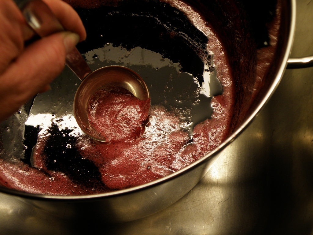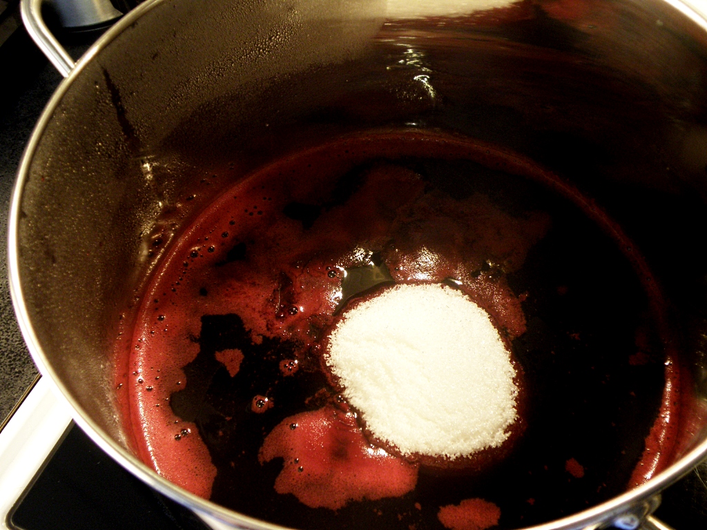 Mål opp saften og ha den i en stor gryte. Kok opp og la den koke i 10-15 minutter. Tilsett ca 1 kg sukker pr liter saft og kok videre. Rør til sukkeret er oppløst. Dette kan ta en stund, alt etter stivelsesinnholdet i bærene. Sukkermengde kan variere litt fra bærtype til bærtype, derfor har jeg en ca-angivelse