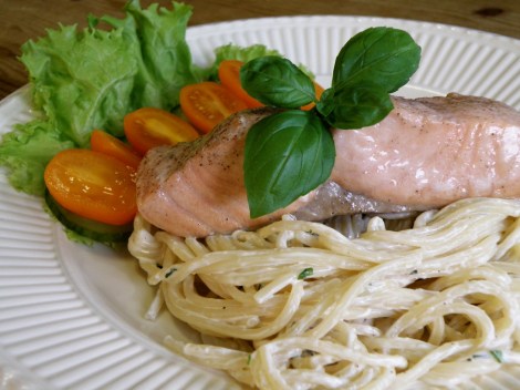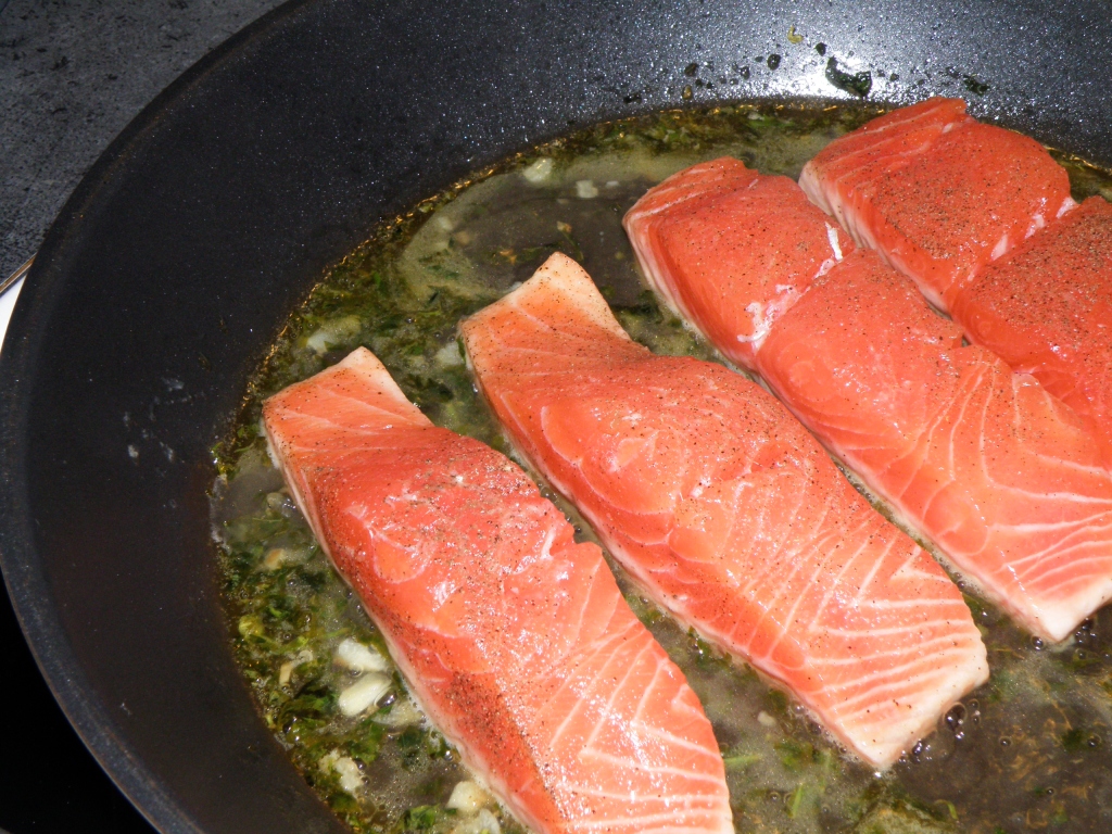 Kok opp vann og salt og legg i pasta. Mens dette koker, smeltes smør i en panne. Surr hvitløk og hakket basilikum til det så vidt begynner å ta farge. Hell i hvitvin i pannen tild et står ca 1 cm opp mot kantene og legg i laksebitene som er krydret med salt og pepper. La dette surre under lokk på middels varme.