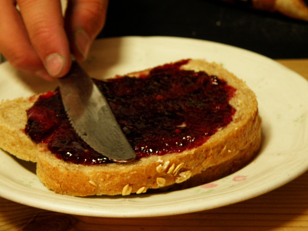 Bærene ble kokt med litt vann til de saftet seg. Dette ble satt til siling over natten. Saftmengden ble ca 2 liter og dette ble kokt med 2 kg sukker til det holdt geléprøven. Geléen ble fylt på varme, steriliserte glass. Og som du ser av bildet skulle min sønn kvalitetsteste geléen nokså med en gang…