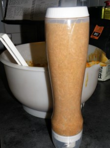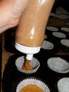 Det passet jo ganske bra, jeg hadde bestilling på «et brett» med gulrotcupcakes, så jeg fikk testet den ut med en gang. Nå var min røre betraktelig større enn det som gikk oppi pennen, den tar ca 12 vanlige muffins. Jeg lagde 48… Men det gikk greit å fylle på fra en større bolle med helletut. Og det var jo så mye enklere å fylle formene med denne enn med en skje, og mye lettere å hanskes med enn en sprøytepose. Denne kan du sette på lokket og sette klar uten at det tyter ut fra tuten. Den er gummiert og tettes helt mot lokket.
