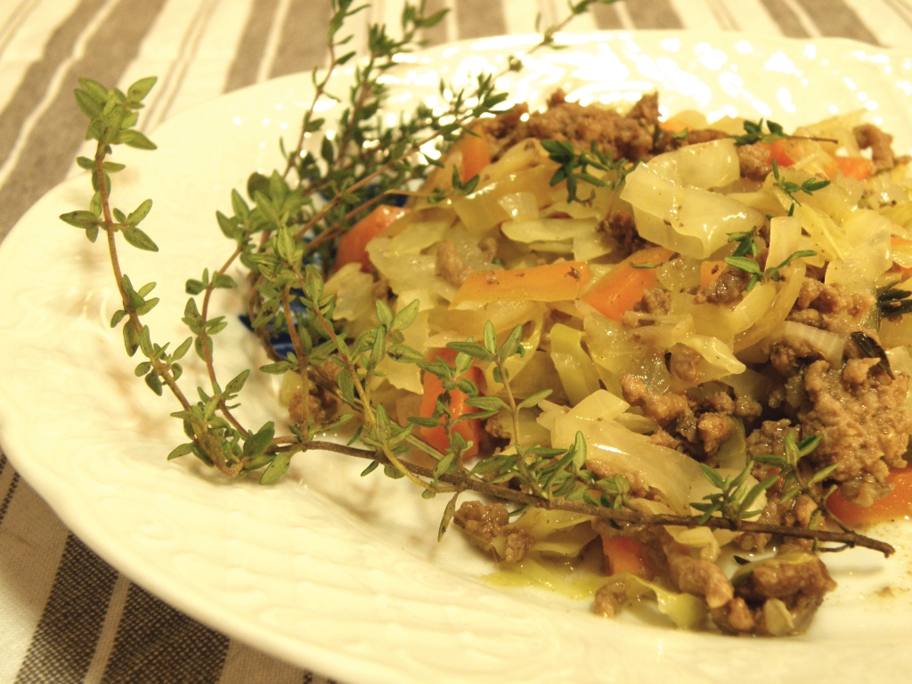 Smelt smør i en jerngryte og surr kålen til den er myk og begynner å brunes. Stek kjøttdeigen samtidig i en stekepanne. Ha gulrøtter, løk og kjøttdeig oppi kålen og ha i litt vann. Ha i hakket timian og smak til med salt og pepper. La gryten trekke under lokk til alt er mørt.