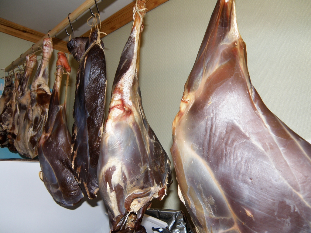 Det har blitt endel spekemat i år. Bildet under viser lår og bog av sau, geit og rådyr, i tillegg henger det en rådyrfilét innimellom. Bog skal brukes i stedet for «pinner» til julemiddagen. Det er litt mer kjøtt på en bog enn det er på det tradisjonelle pinnekjøttet.