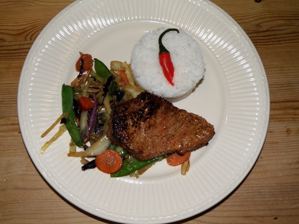Biffen denne gangen har jeg krydret litt annerledes enn den klassiske salt og pepper-varianten, jeg har brukt tandoori masala. Riktignok et krydder som anbefales til kylling, lam og fisk, men nå har jeg vel aldri fulgt en anbefaling slavisk… Sammen med biffen har jeg wokede grønnsaker og ris, et rask måltid etter en lang dag på jobb.