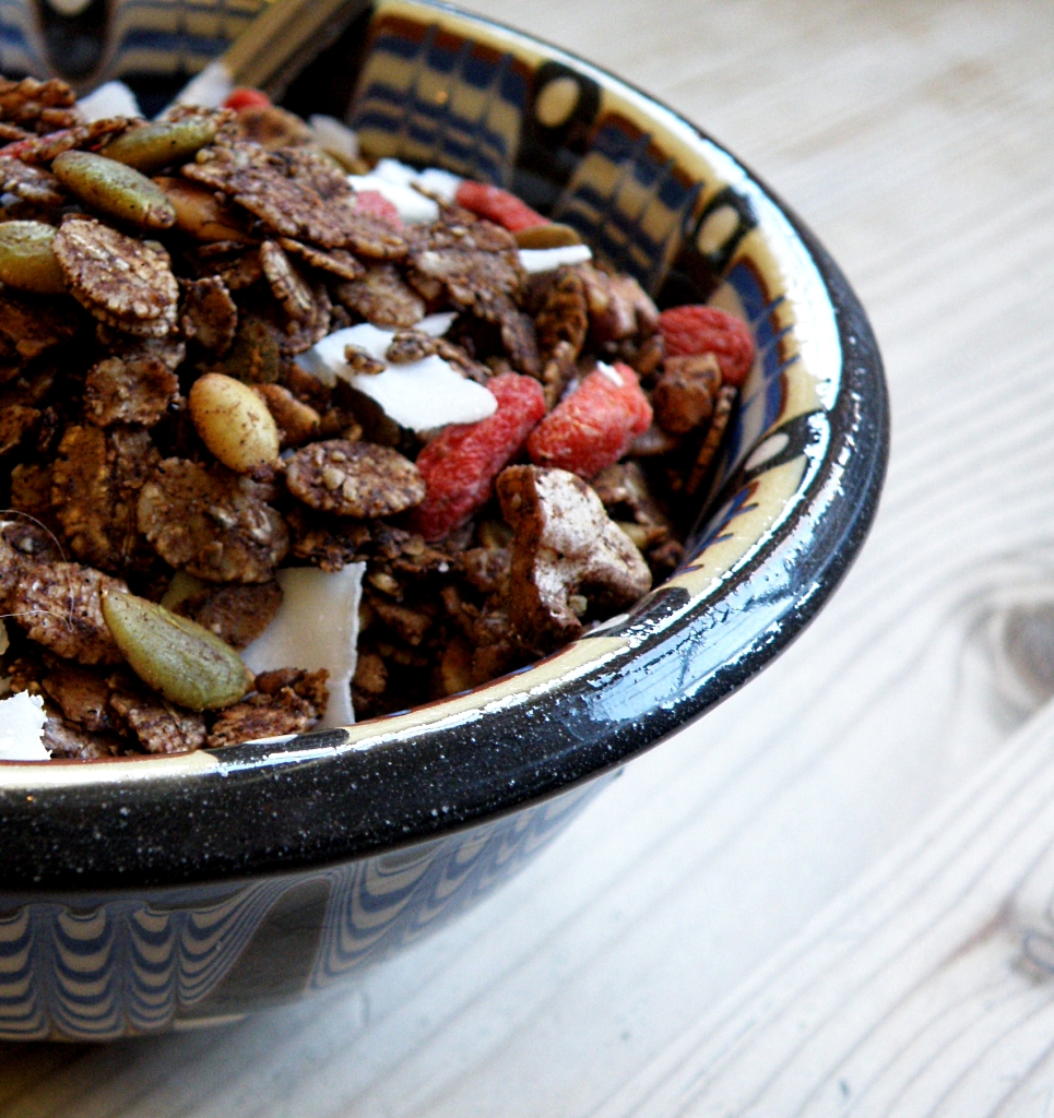 Jeg har brukt Lucuma og rå kakao i denne granolaen. Oppskriften har jeg satt sammen selv av det jeg hadde i skuffer og skap. Fin måte å få ryddet på…