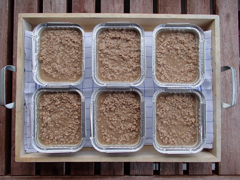 Kalv er rikt på naturlig gelatin og den egenskapen er utnyttet i dette pålegget. Opprinnelig ble det laget av kalvehoder og kalveføtter, men i dag har husbonden kokt ryggbein, sener og skrapkjøtt av en kalv han måtte ha nødslakt på for en bonde. Min jobb ble å rense beina for kjøtt – jeg føler ennå at hendene er fulle av lim…