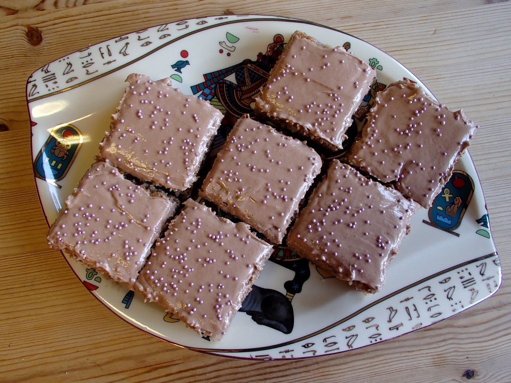 Alt røres sammen til en luftig og smidig glasur. Smør glasuren på avkjølt kake og skjær i passe biter. Nyt.