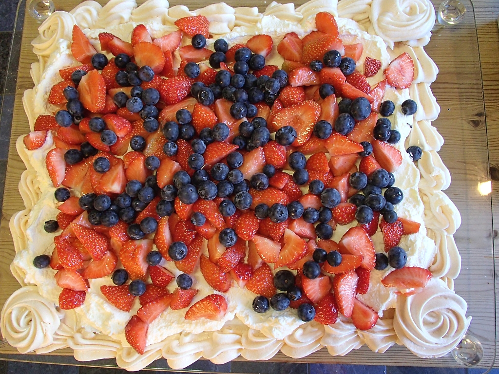 Pavlova – eller marengsbunn – kan veldig godt stekes i en langpanne eller på stekebrett. Det er ypperlig om man skal servere til mange. Mengde egg var litt verre å beregne, men jeg tok utgangspunkt i 8 eggehviter. Det var egentlig en passe mengde, jeg fikk 20 pikekyss i tillegg..
