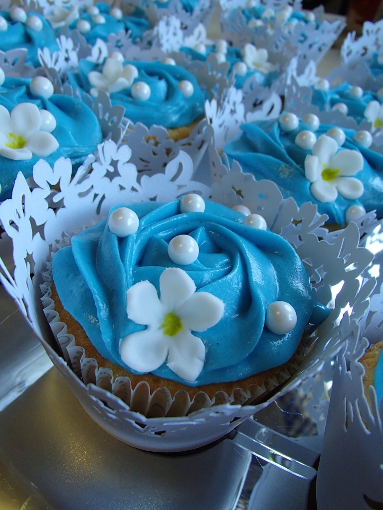Cupcakene var sitroncupcakes pyntet med store strøsselperler og en blomst laget av fondant. Litt jobb å lage nærmere 150 slike blomster.