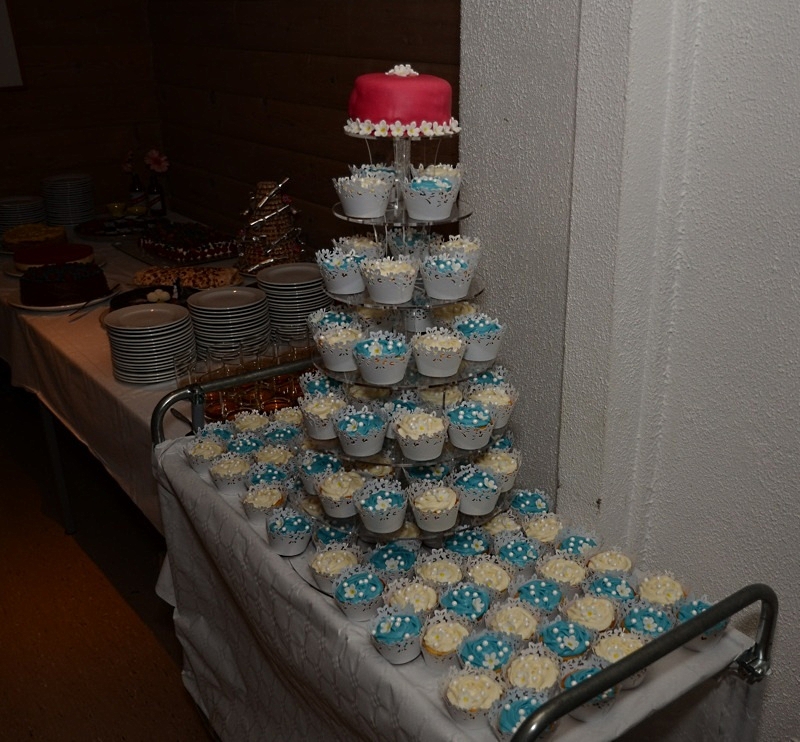 Bruden var utradisjonell i fargevalget. Halvdelen av cupcakene skulle være blå, resten hvite. Og kaken på toppen skulle være knall rosa. En kjempegøy utfordring.