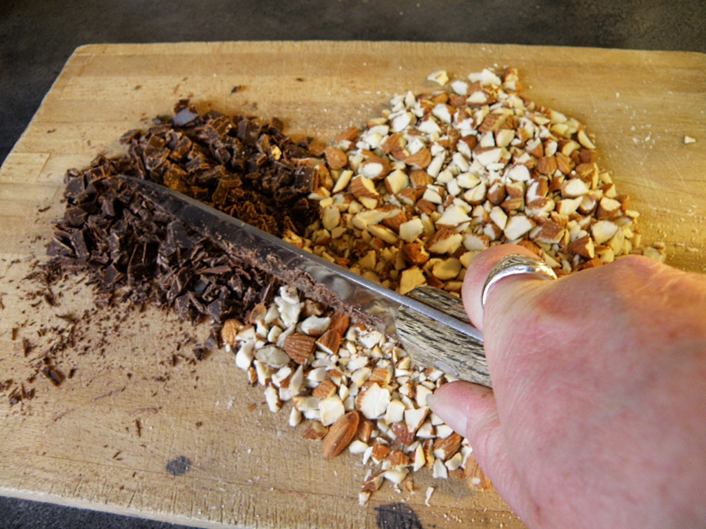 Grovhakk mandler og sjokolade. Jeg gjør det på gammeldags vis med kniv, da har jeg mer kontroll over hvor små bitene blir. Pisk egg og sukker til stiv eggedosis og vend inn sjokolade og nøtter/mandler. Ha røren i en springform med papir i bunnen og stek kaken på 175 grader i ca en halvtime. Prøv med en kakenål. Avkjøl på rist.