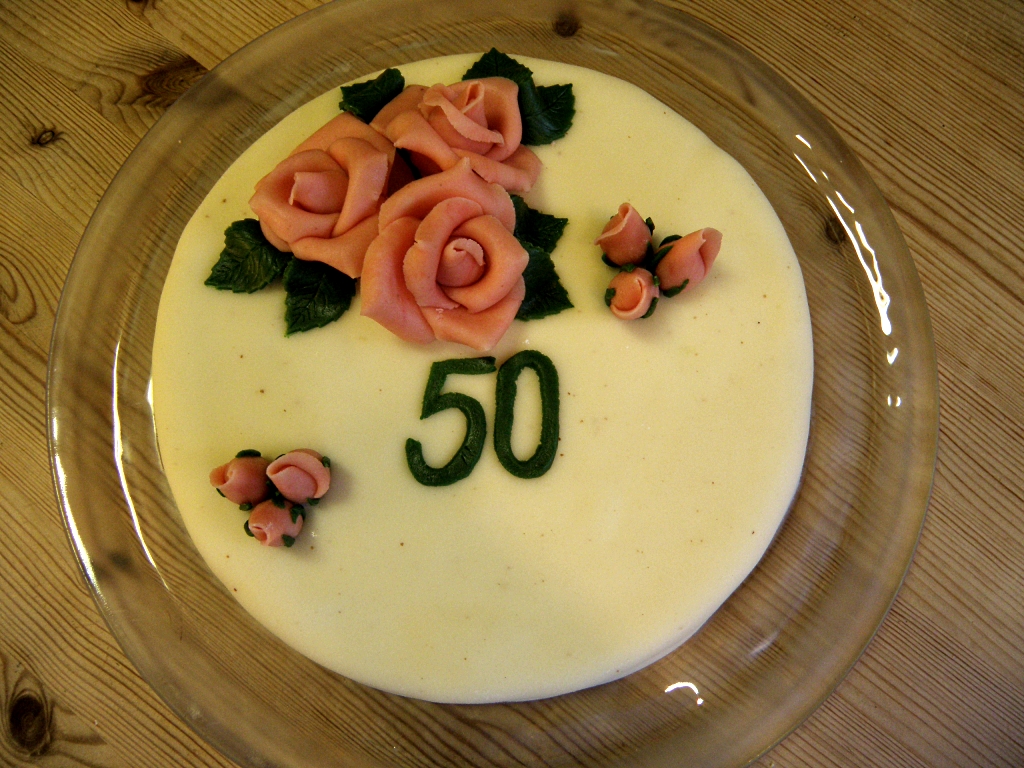 Dekk kaken med pisket krem av 3 dl kremfløte. Deretter trekkes kaken med marsipan og pyntes etter eget valg. Kaken blir ikke høy som en vanlig marsipankake, så du har ikke gjort noe feil når du syns den har hevet seg dårlig…