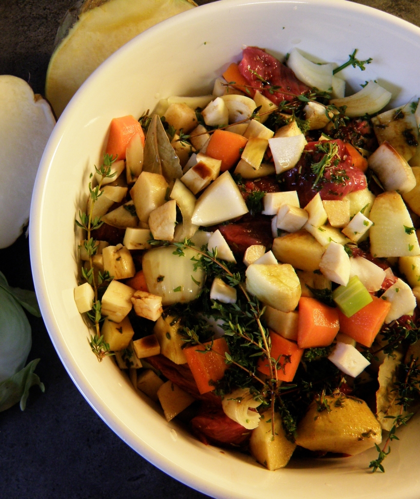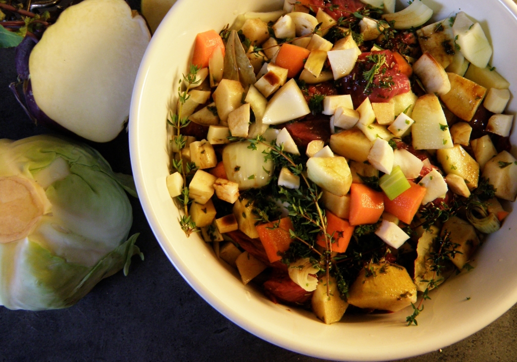 - 1 kg assorterte grønnsaker (gulrot, kålrot, løk, sellerirot, knutekål, persillerot etc.)