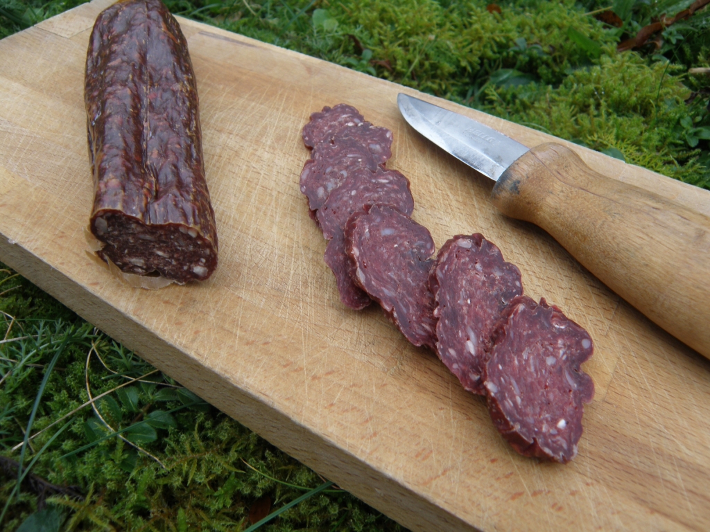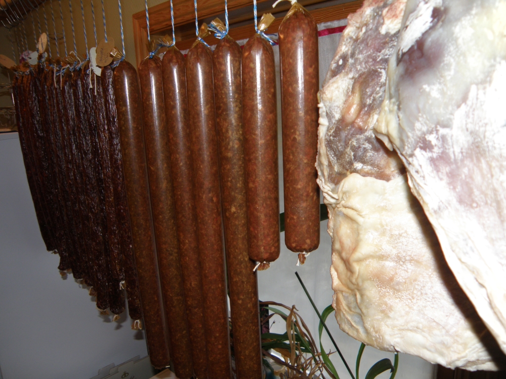Nok et innlegg om spekepølser, bare at nå er de første begynt å bli ferdige. Tidligere år har vi brukt naturtarm, i år prøvde vi med fibertarm. Litt skeptisk, men det var heldigvis ubegrunnet. Det ble pølser i flere omganger da min mann har vært rundt og slaktet i flere vendinger. Noen pølser er ren hjort, andre er en blanding av elg, sau og geit. De siste pølsene er av kun sau. Totalt har det blitt laget spekepølser av over 19 kg kjøtt. Legger vi til pølsene en kompis var hos oss for å lære å lage, nærmer vi oss 25 kg.