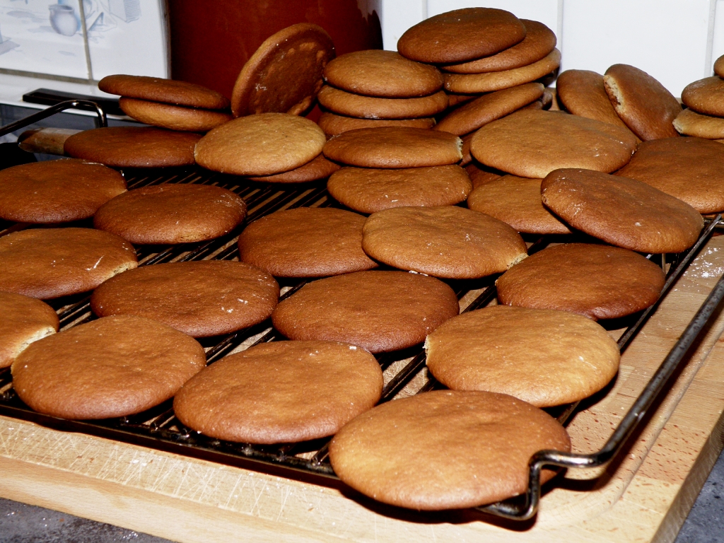 Kna inn resten av melet. Så kommer utbakingen. Trill kuler som trykkes litt flate eller kjevle ut deigen litt tykk og stikk ut runde kaker. Stekes på 200 grader til de er fint brune. Avkjøles på rist og oppbevares i tett boks.
