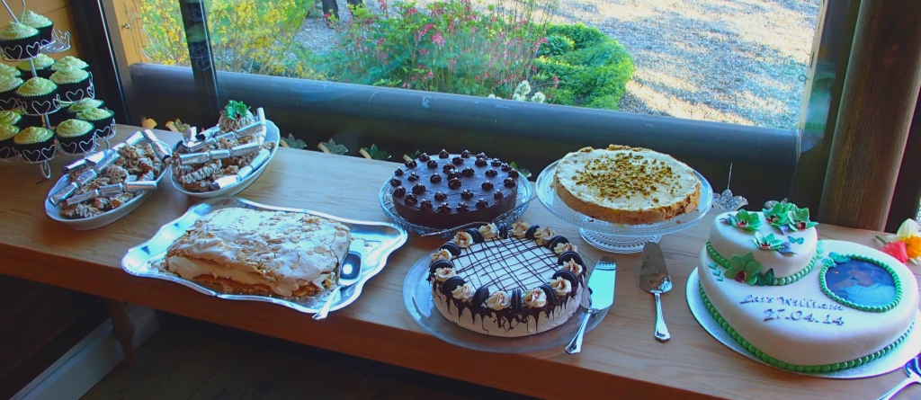 Sjokoladecupcakes, kransekake, verdens beste, sjokoladekake, «oreo»kake, suksesskake og marsipankake fylt med bringebær. Konfirmantens mor er kunstneren bak marsipankaken ( og kransekaken). Resten er bidrag fra tanter og bestemødre.