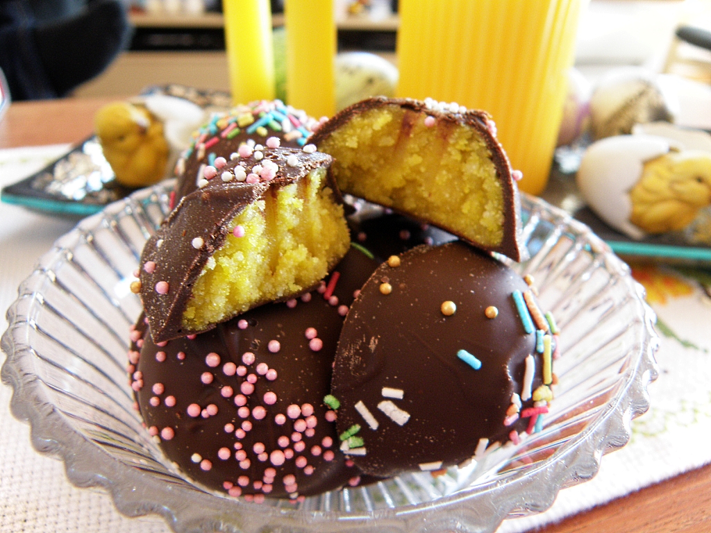 Mal mandlene to ganger og bland godt med melis og tragant. Tilsett eggehviter, litt om gangen og kna massen godt. Dersom massen virker tørr, justerer du med vann. Kna til du har en smidig og god masse, og pakk den i tett plast til dagen etter. Da får den satt seg litt bedre. Så kan massen farges og formes etter eget ønske. Ungdommene her lagde kuler i alle regnbuens farger, dyppet dem i smeltet sjokolade og strødde på farget strøssel. På bildet er det helt tilfeldig at det ble en gul kule jeg brakk i to, og ikke en lilla eller svart eller blå…