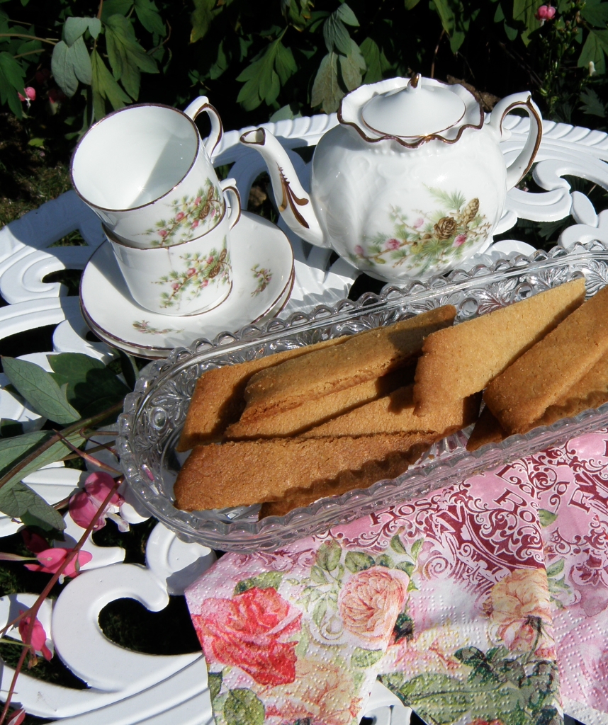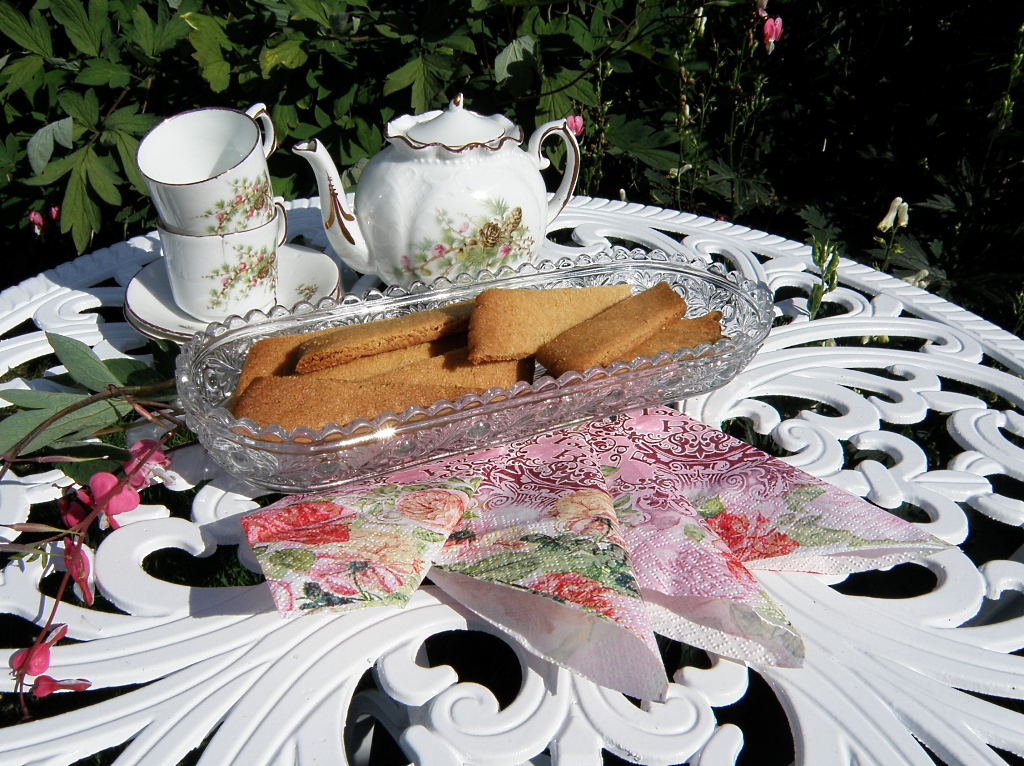 Sommertid og finvær. Kaffe i hagen – eller te om vil. Da passer det med en liten småkake å bite i. Disse småkakene har jeg bakt nesten hver sommer, oppskriften har jeg fra midten av 80-tallet. Da pleide min mor å bake disse, sammen med noen som heter sjokoladeavskjæringer (som vil bli blogget ved en senere anledning). Mor har sikkert sakset oppskriften fra et eller annet ukeblad. Sommerstid var det disse to småkakene som dominerte kakefatet. Det var ikke før jeg kom inn i min svigerfamilie at jeg stiftet bekjentskap med store oppdekninger om sommeren. Sommerstedet var barndomshjemmet til svigerfar, som han og en søster eide halvdelen hver av. I tillegg var det alltid noen av den eldre generasjonen på besøk – grandtanter og grandonkler og besteforeldre. Da besto oppdekningen av vafler, lapper, swissroll og gjerne surmelkskake – og ikke bare én sort av gangen. Som en litt sjenert 16-åring var det ikke rart vekta økte når svigerfar nødet en til å ta en bit til – og en til.