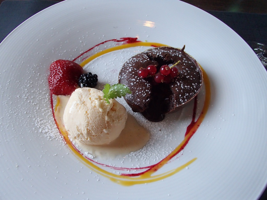 Jeg med min hveteintoleranse kunne ikke dy meg for denne fondanten. Nydelig var den. Så fikk man heller ha litt krøll med magen, selv om det hjelper på med et par enzymtabletter. Andre valgte pannacotta og flamberte crêpes.