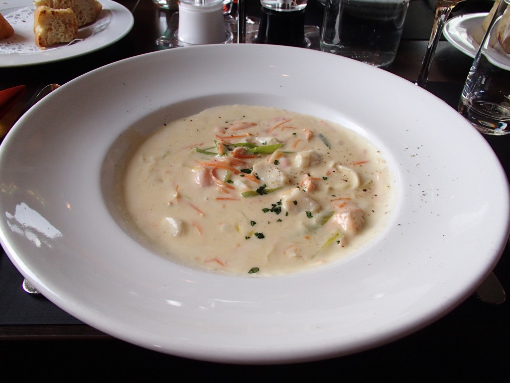 Min forrett – fiskesuppe. Andre hadde karrimarinerte scampi eller mezetallerken.