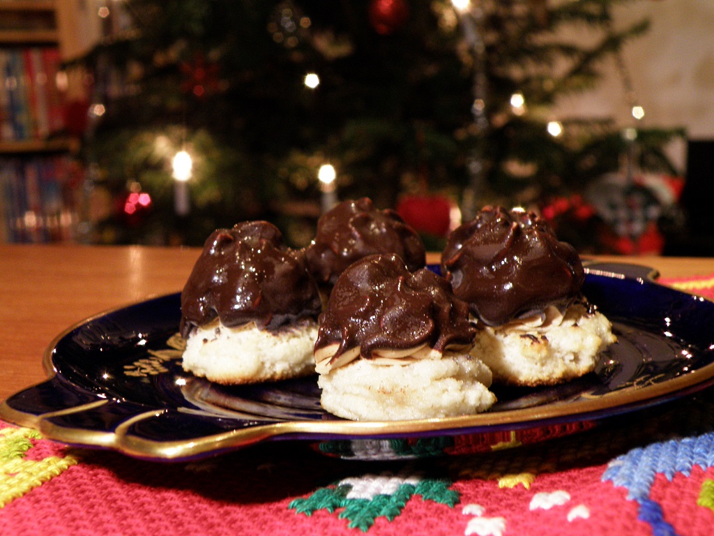 Min «svigerdatter» hadde et ønske om Sarah Bernhardt-kaker til jul, og med dem er jeg totalt oppe i 13 sorter i år. Det kom ikke på tale å fjerne noen sorter, mine sønner har sterke meninger og alle har sine favoritter. Jeg hadde ingen oppskrift, så disse ble det rett og slett googlet litt rundt etter. Etter å ha sett mange varianter, fant jeg ut at jeg kunne gjøre det enkelt med selve makronene og bruke råmarsipan. Min mor pleier nemlig alltid å kjøpe med et kilo råmarsipan fra Danmark til meg når hun og far er på sin årlige juletur. Til meg som ikke liker marsipan… Men denne inneholder 63 % mandler og er fin å bake med.