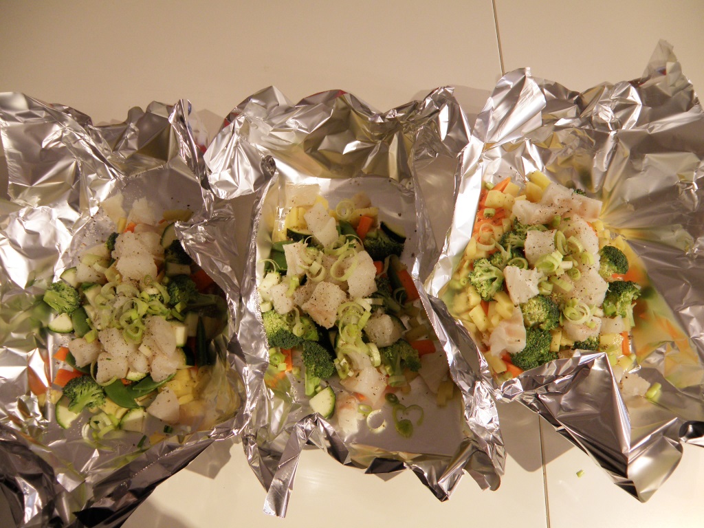 Kutt grønnsaker i små biter. Gulrot, vårløk, squash, sukkererter, blomkål, brokkoli – bruk det du liker. Paprika er fargerik og fin, men har en tendens til å bli litt dvask og seig i skallet. Velger du å ha i poteter, må disse kuttes ganske smått. Om ikke gulrøtter er helt møre gjør ikke det så mye, men poteter som ikke er gjennomkokt smaker ikke helt godt. Fordel grønnsakene på foliebitene.