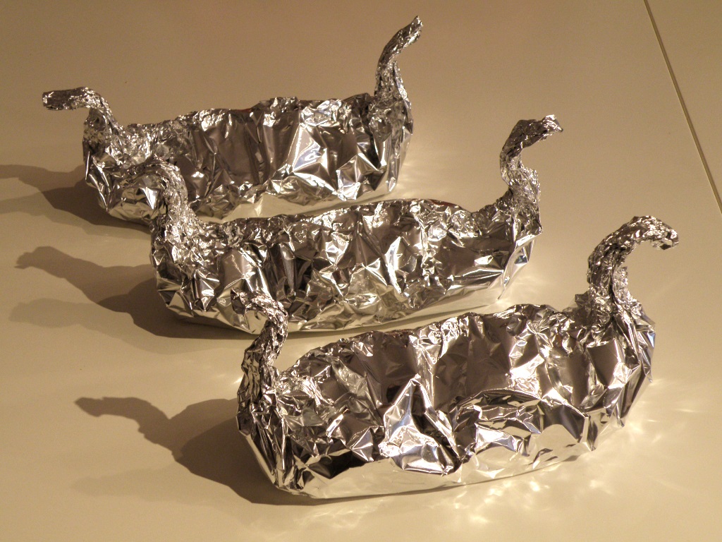 Dryss over litt salt og pepper, klipp over litt urter om du vil, en liten skvis med sitron gjør seg også. Så pakker du alt inn i en avlang pakke og former endene i en lang tut som du former som stavnen og akterenden på et vikingskip.