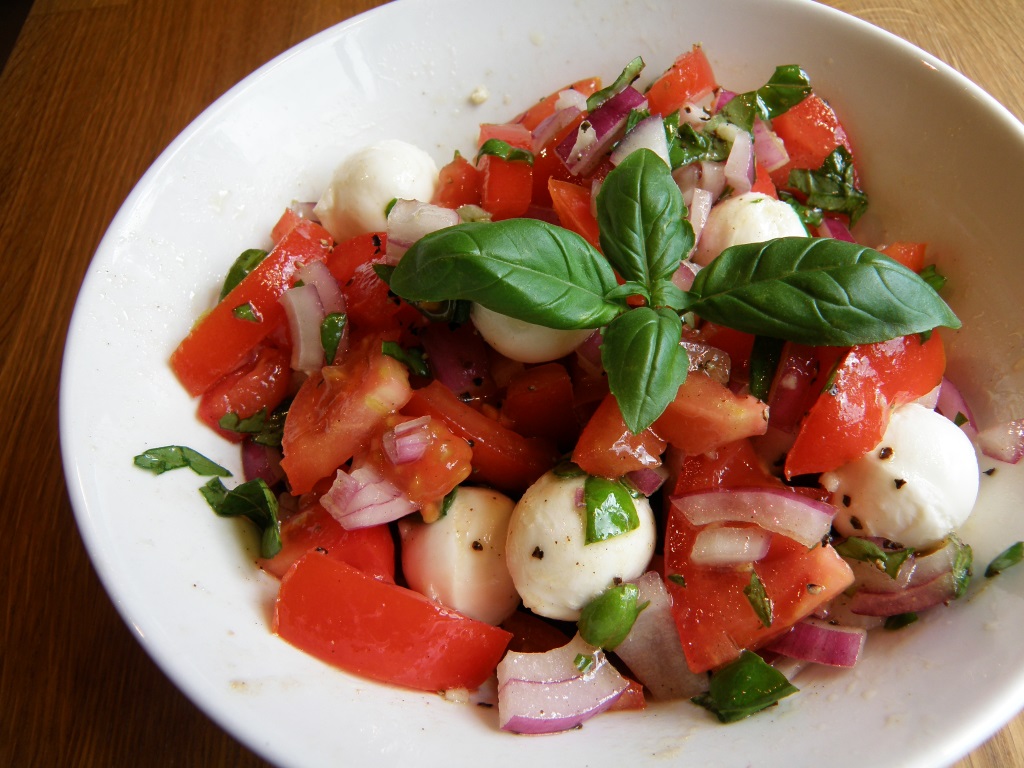 Skjær tomater i litt store biter og rødløk i strimler. Grovhakk basilikum og finhakk hvitløk. Ha tomater, løk og basilikum i en bolle/skål og dryss over krydder. Ringle over olje og litt balsamicoeddik. og bland alt lett sammen. Topp gjerne med biter av mozzarella om du liker det.