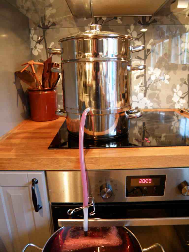 Som bildet viser er det en klype på avtappingsslangen. Første koking lot jeg den være på og gjorde andre ting innimellom – helt til brannvarsler og alarm slo ut. Da hadde vannet i den underste gryten fordampet, saft hadde rent over og ned i den tørrkokte gryten og begynt å svi. Den gryten så ikke bra ut etterpå. Fastbrent solbærsaft lot seg ikke skrubbe bort. Heller ikke hjalp det å la gryten stå i maskinoppvask. Men jeg fikk den ren likevel, på husmorvis. En halv sitron og et par stilker rabarbra sto og småkokte et par timer, og det gjorde susen. Gryta ble ren og pen igjen. Og jeg lot saften renne fritt ned i neste gryte og passet hele tiden på at det var vann i den nederste gryten.