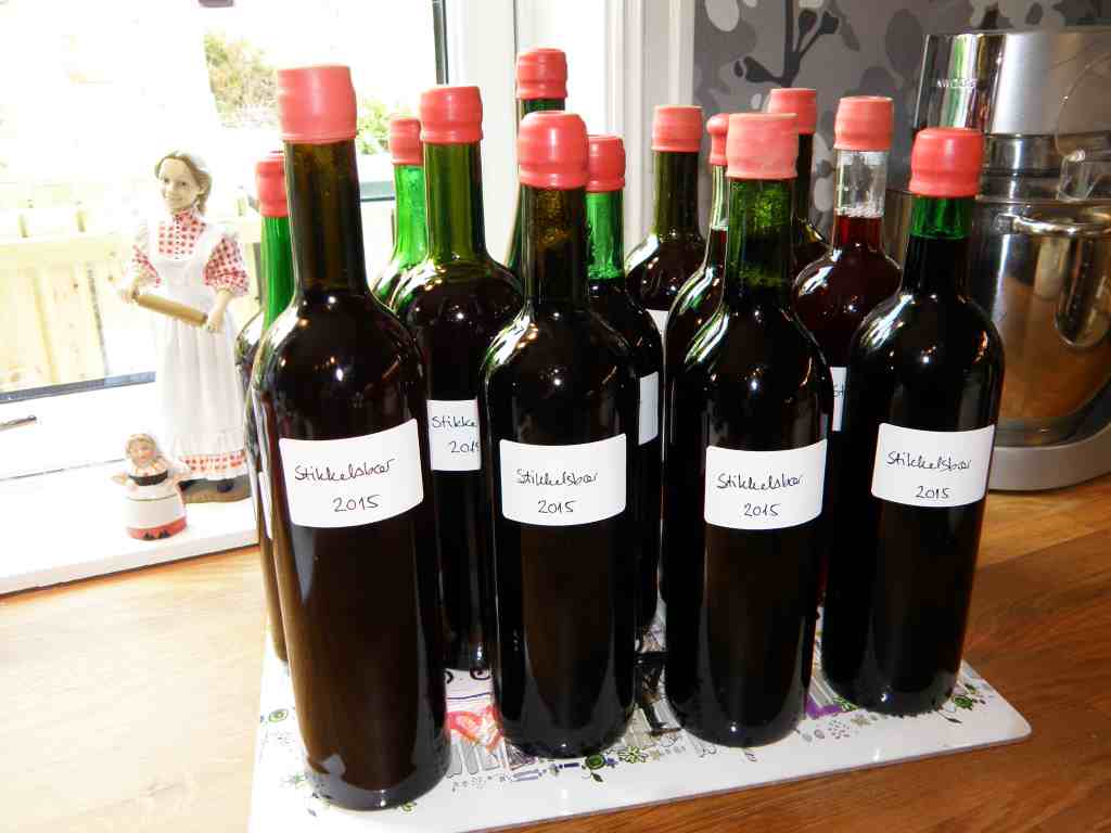 Det ble noen liter med saft til slutt. 4 liter solbær, 3 liter blandingssaft av blåbær og bjørnebær, og 7,5 liter stikkelsbærsaft. Og den er søtet med sukker. Jeg tar heller ett glass sukret saft enn kunstig søtet brus. Da blir søtbehovet dekket og jeg leter ikke etter smågodt og sjokolade utover kvelden..