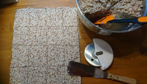 Det siste året har det blitt laget noen tusen knekkebrød på kjøkkenet mitt. Brød er så godt som borte fra bordet vårt. Jeg har hatt oppskrifter jeg har gått ut i fra og tilpasset til en smak og konsistens som passer ganen til alle i heimen – spesielt dem som ikke liker kokos, siden det er kokosmel i knekkebrødene. Min oppskrift er tilpasset 3 stekebrett til innebygningskomfyr. Vanlige stekeovner har større brett, det hadde ikke falt meg inn da svigermor fikk oppskriften av meg. Hun kalte knekkebrødene blonder da de ble så alt for tynne. Så dersom du har store brett, fordel massen på 2 brett, ikke 3.